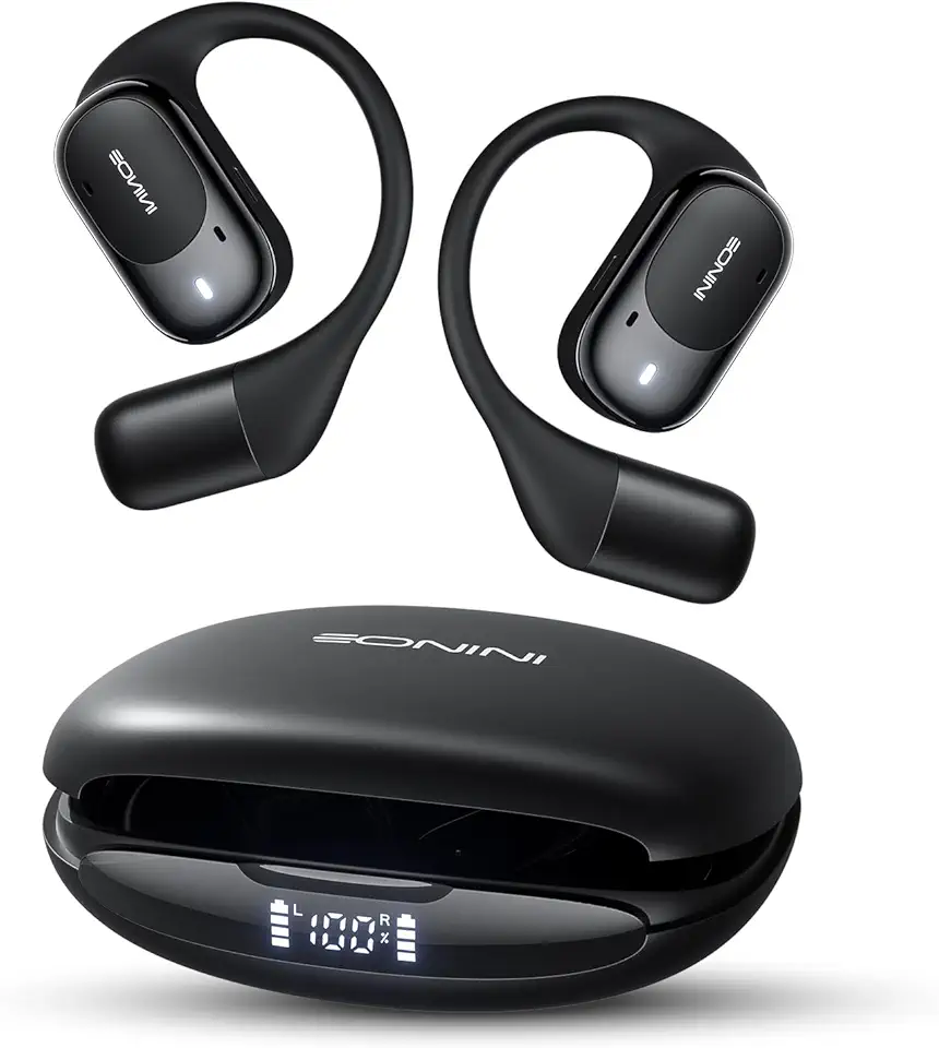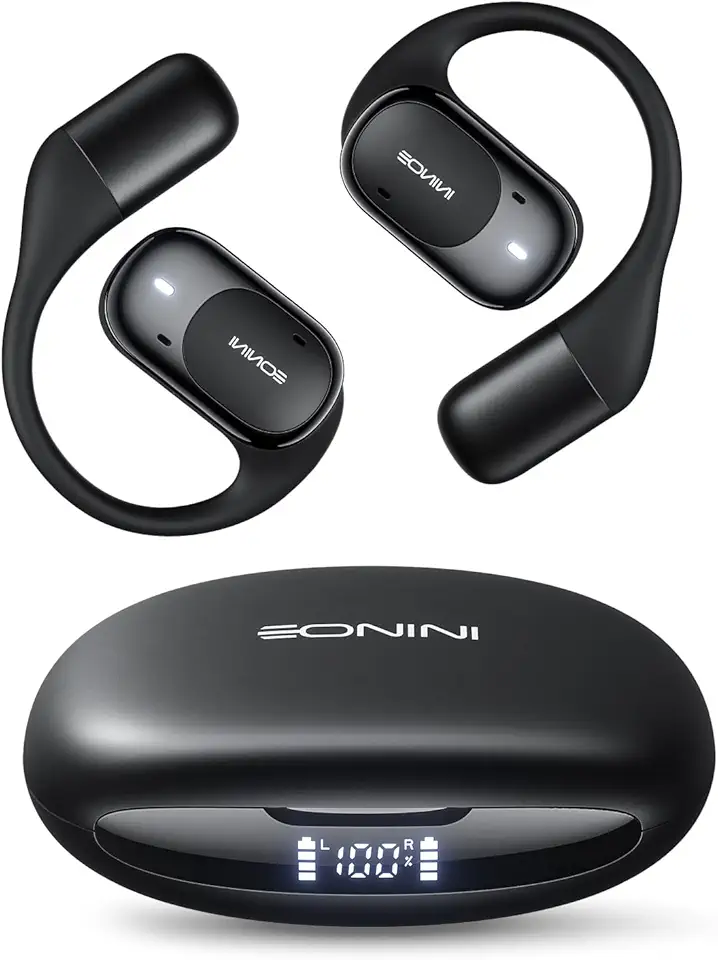 Eonini Open-Ear Earbuds (smart display, 40H playtime, 0.5 lbs). Secure fit, clear calls, IPX5 waterproof. For workout/running. 1-year warranty.